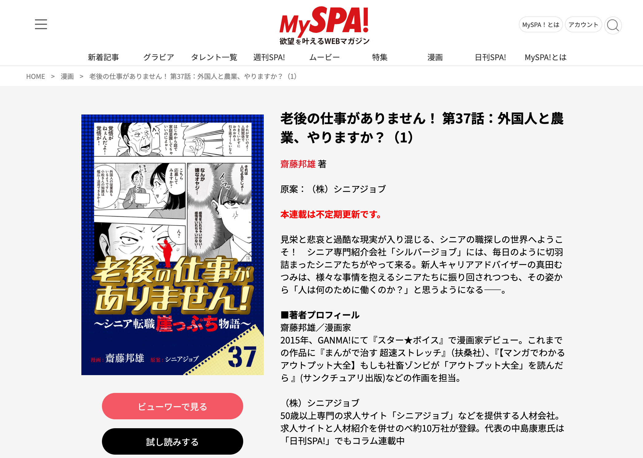 当社が原案を担当し、扶桑社の週刊SPA!が運営する電子版有料サブスクサービス『MySPA!』で連載されている漫画、『老後の仕事がありません! 第37話:外国人と農業、やりますか?(1)』が2025年9月26日に更新され、就農希望のシニアが外国人労働者と一緒に仕事をすることになる新たなストーリーがスタートしました。