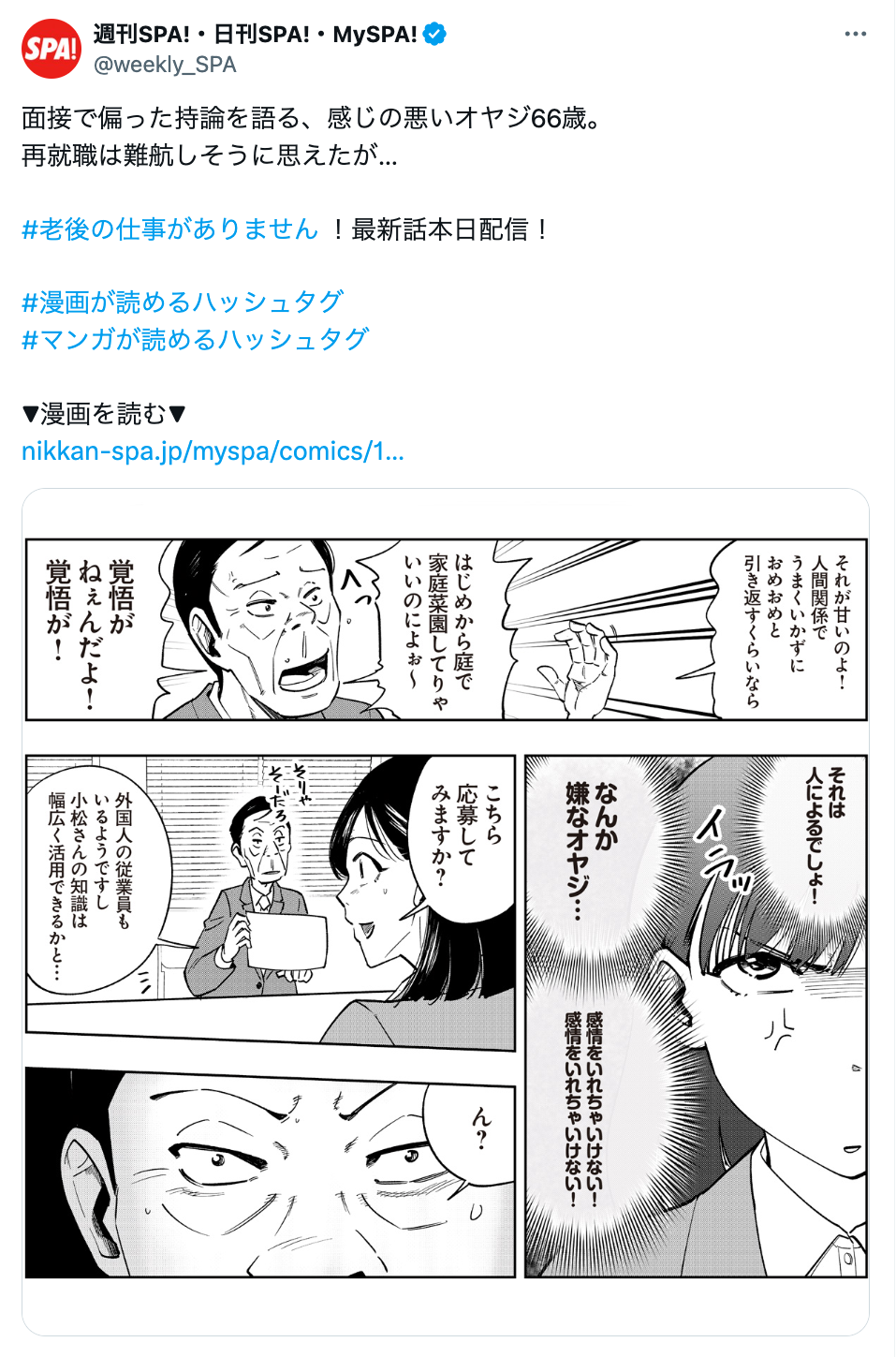 2024年7月17日に漫画の1〜3話が無料公開されたことにともない、MySPA!の漫画ページでは更新分の試し読みができなくなっていますが、SPA!のXアカウントでは漫画の一部の絵が投稿されています。