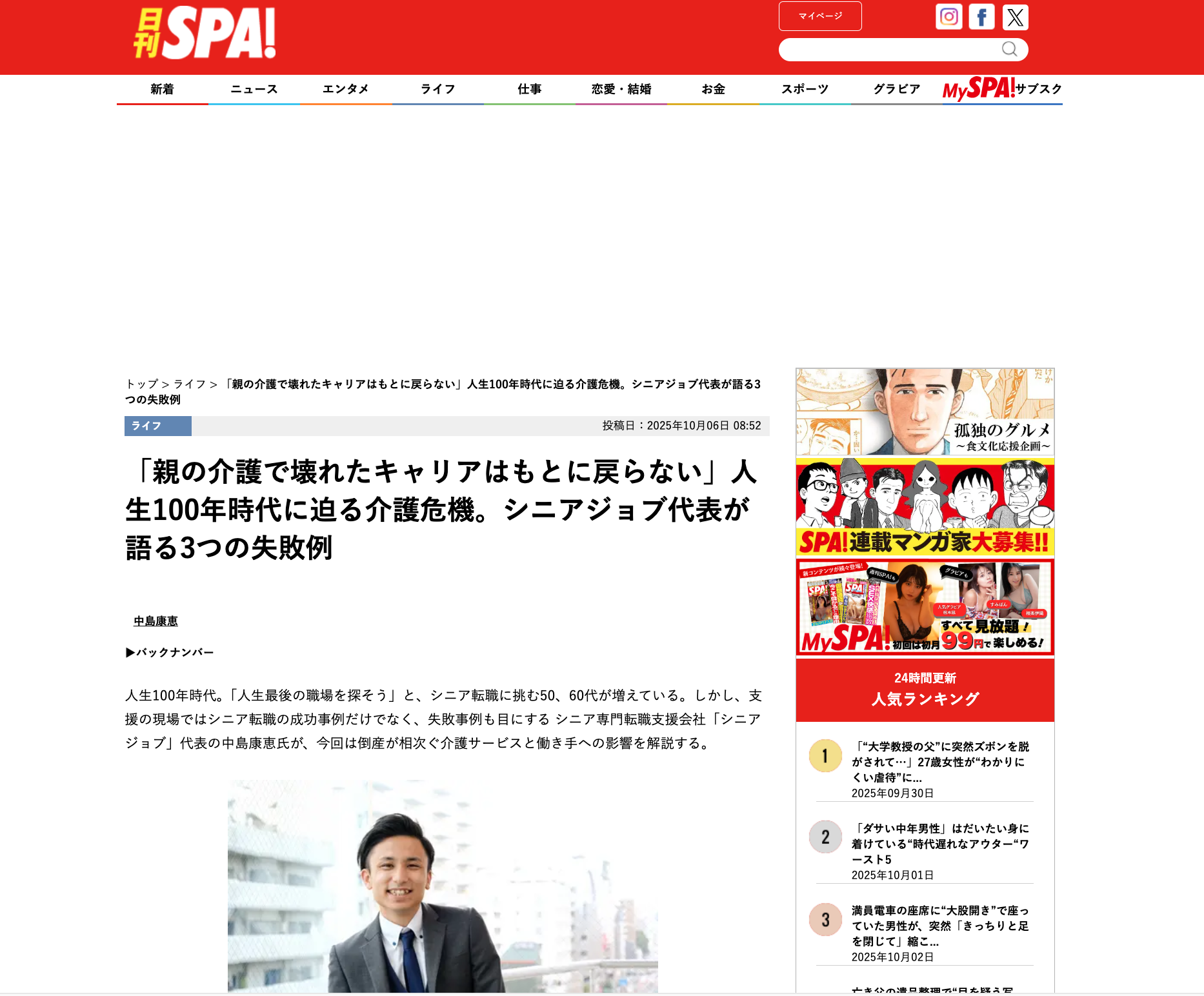 週刊SPA!のニュースサイト『日刊SPA!』(扶桑社運営)において、当社代表取締役 中島康恵の連載コラムが2025年10月6日に更新され、老老介護がシニアワーカーのキャリアに与える影響についてのコラム『「親の介護で壊れたキャリアはもとに戻らない」人生100年時代に迫る介護危機。シニアジョブ代表が語る3つの失敗例』が公開されました。