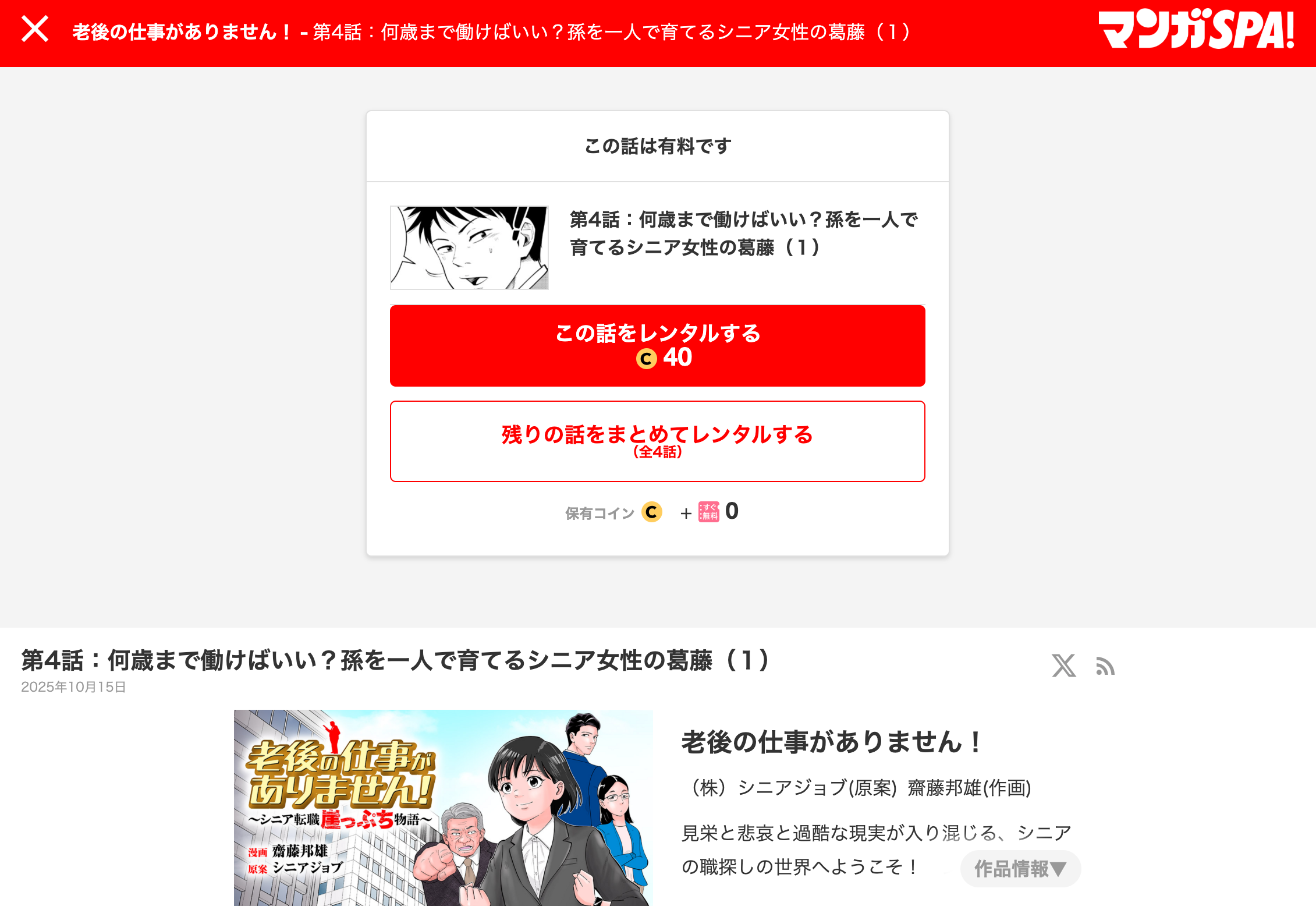 当社原案マンガ『老後の仕事がありません!』の第4話が週刊SPA!の公式マンガサイト、マンガSPA!で公開されました