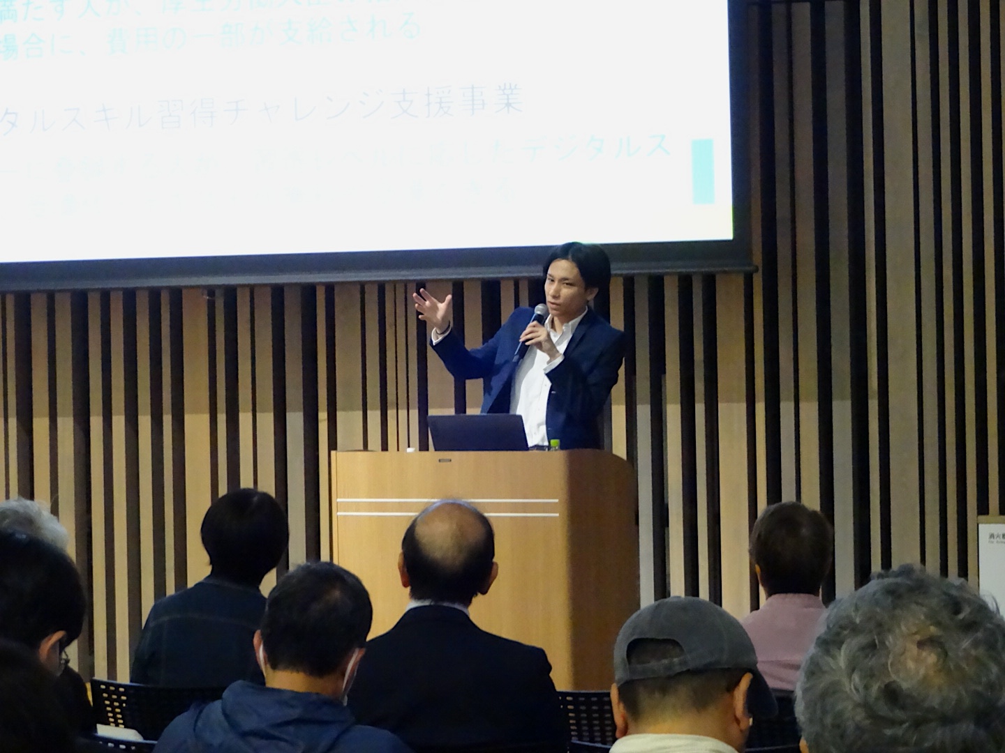 国や都のAI・DX関連の教育・就職支援のパートでは、中島は経済産業省や厚生労働省、そして東京都のAIに関するリスキリングの支援を中心に紹介・解説、AI・DX知識のシニア就職での必要性のパートでは、シニア専門求人サイト「シニアジョブ」で実際に掲載されているITエンジニアの求人数や自社内のシニア社員の働き方などを中心に解説を行いました。