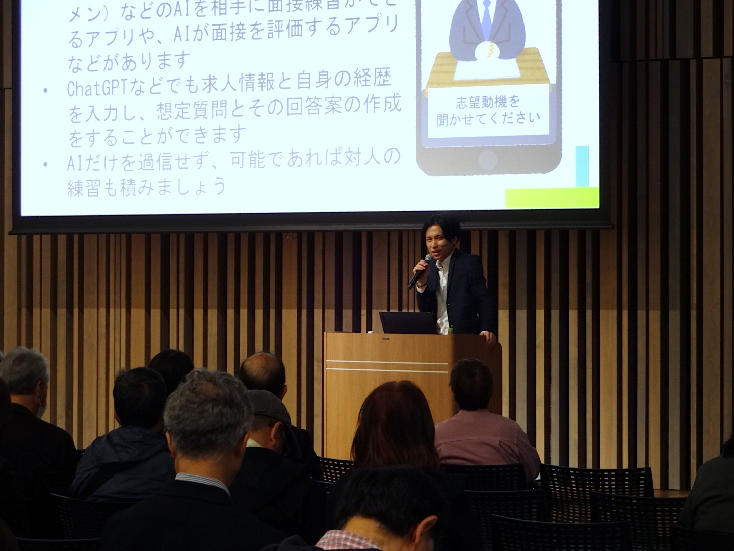 八王子会場のセミナーの最後を飾る15時からスタートの4番目のセミナー二登壇した中島は、「これからのシニア就業の需要とAI」と題し、AIがシニアの就職にどのような影響を与えるのか、シニアは就職にAIをどう活用すればよいのかといった話をしました。