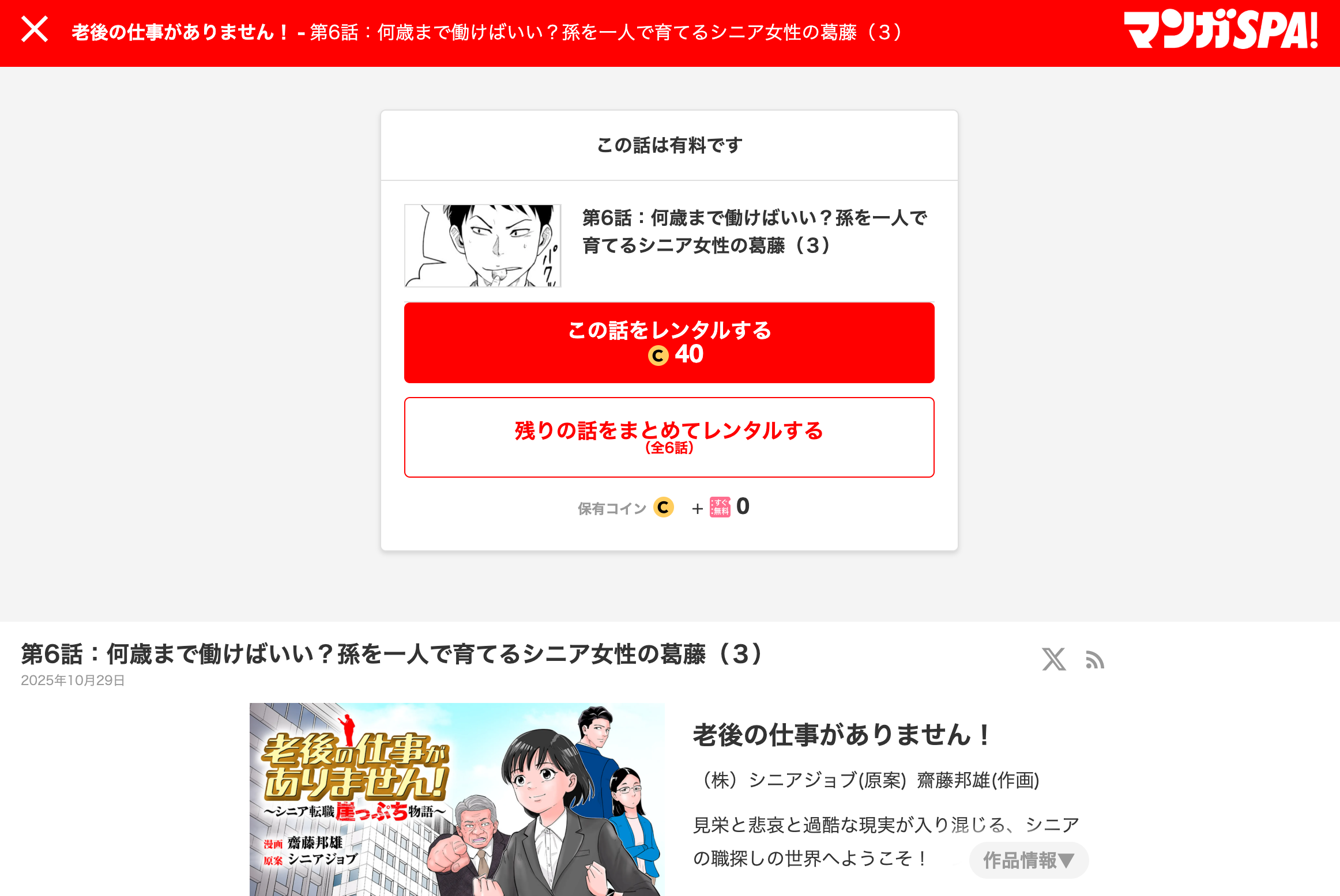 当社原案マンガ『老後の仕事がありません!』の第6話が週刊SPA!の公式マンガサイト、マンガSPA!で公開されました