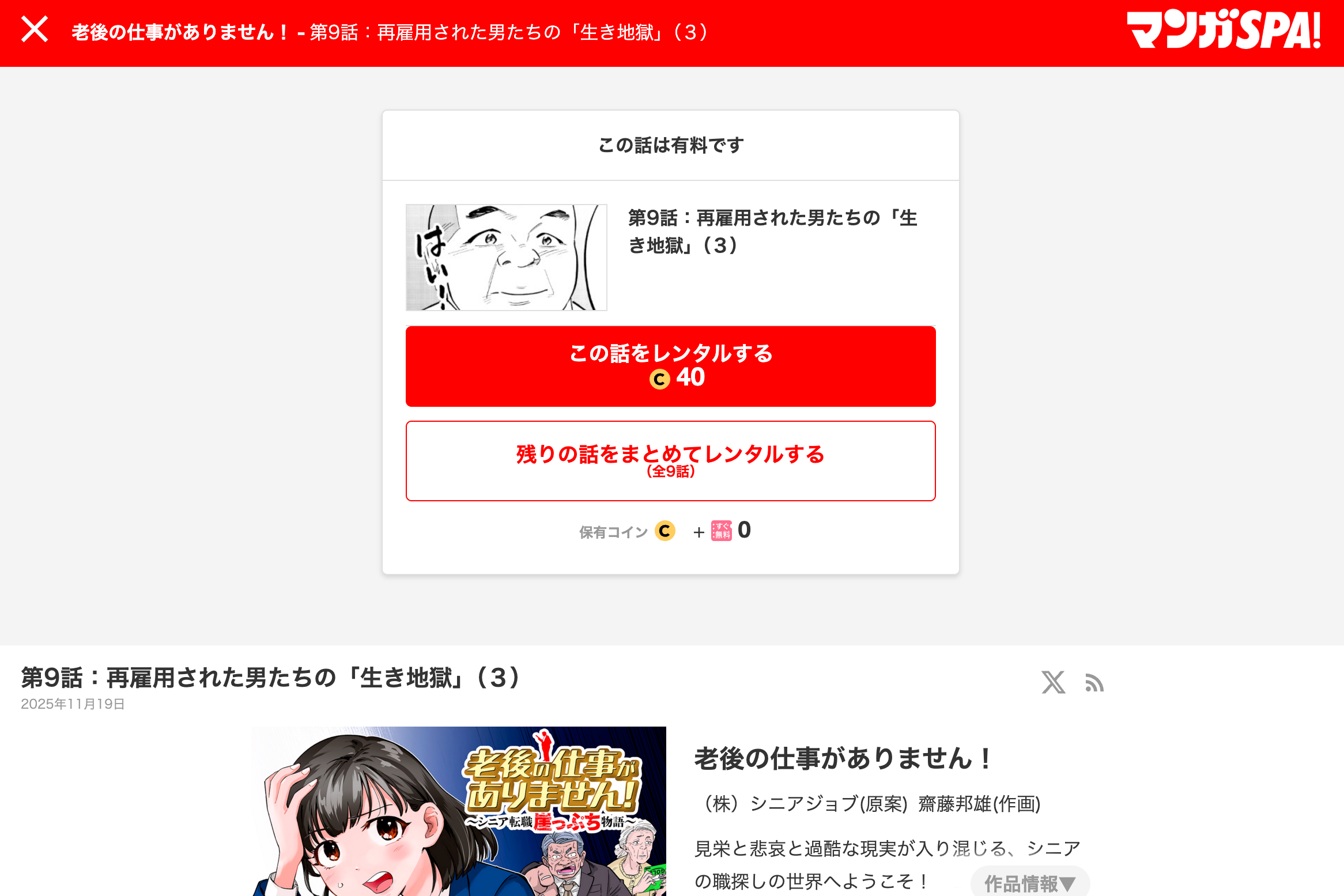当社が原案を担当し、雑誌「週刊SPA!」の公式マンガサイト「マンガSPA!」で連載されているマンガ「老後の仕事がありません!」の最新回「第9話:再雇用された男たちの「生き地獄」(3)」が2025年11月19日に公開されました。