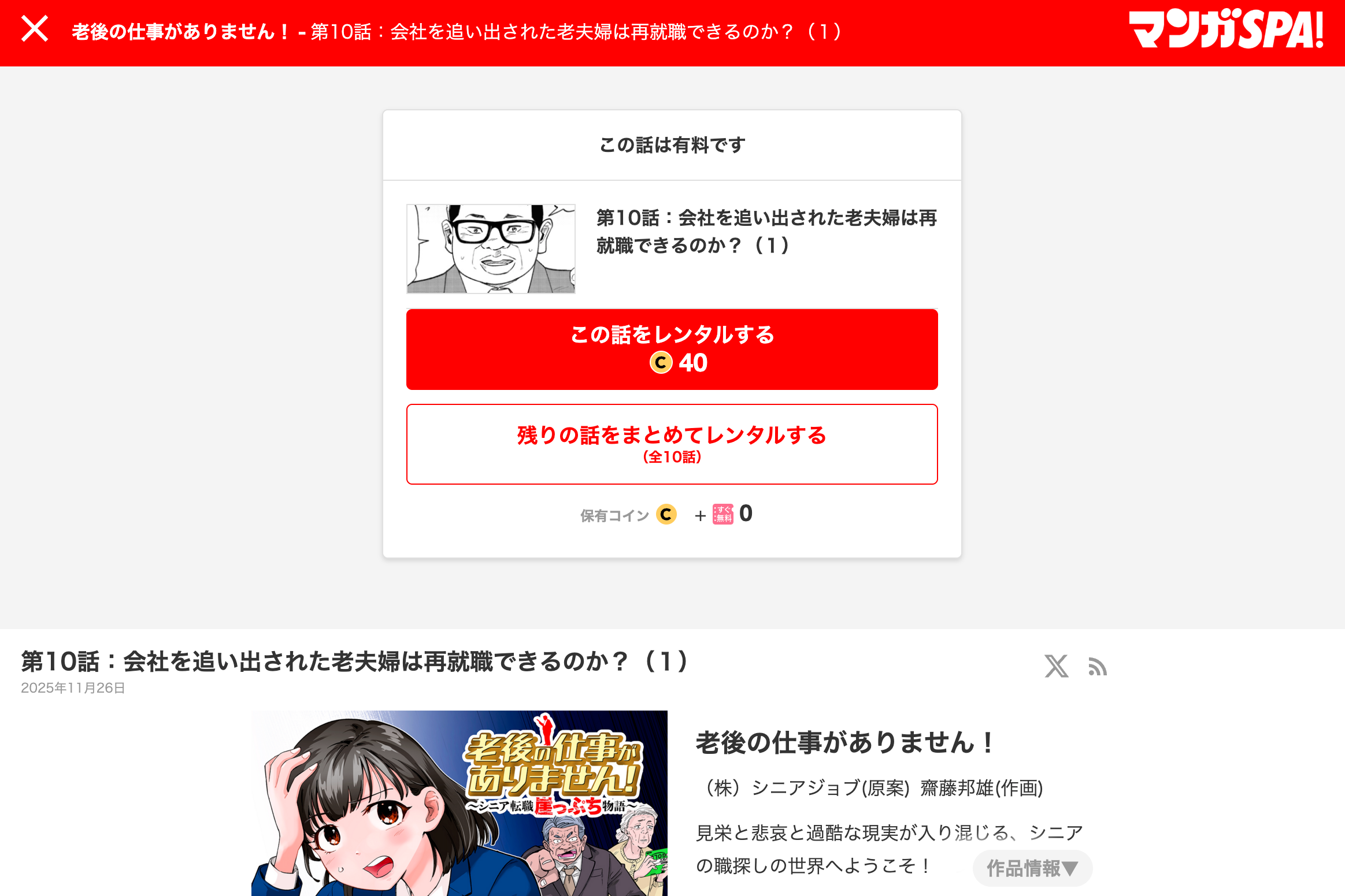 当社が原案を担当し、雑誌「週刊SPA!」の公式マンガサイト「マンガSPA!」で連載されているマンガ「老後の仕事がありません!」の最新回「第10話:会社を追い出された老夫婦は再就職できるのか?(1)」が2025年11月26日に公開されました。