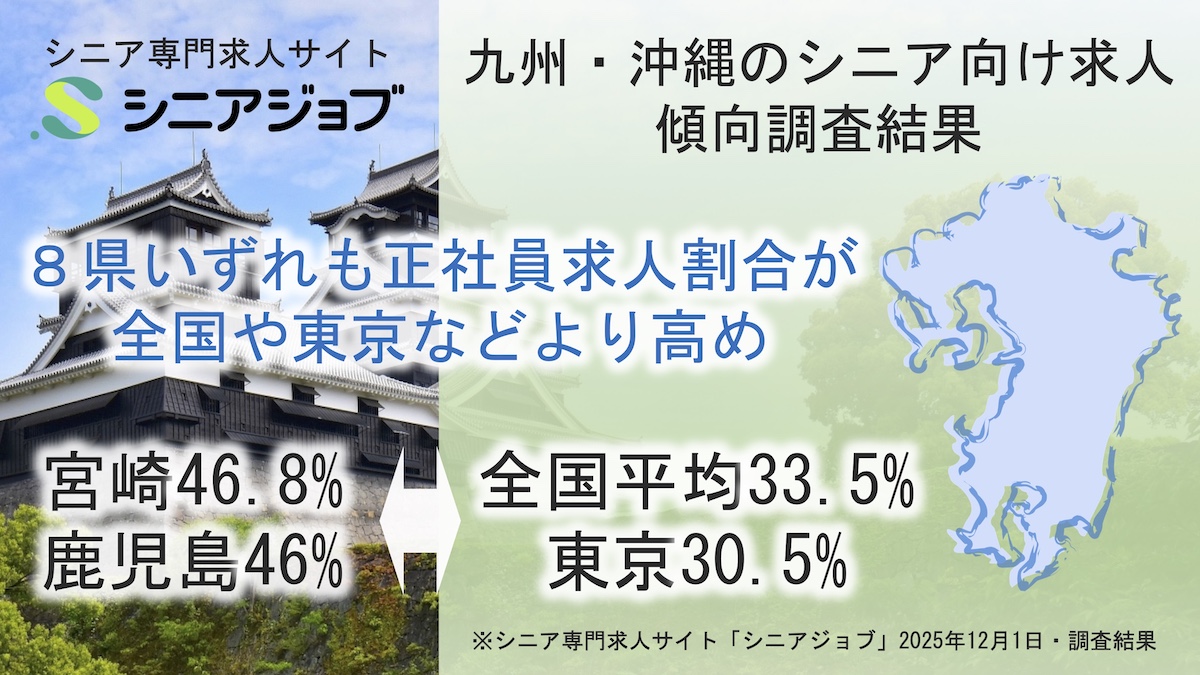 シニア転職支援の株式会社シニアジョブ(本社:東京都新宿区/代表取締役 中島康恵)は、運営するシニア専門求人サイト「シニアジョブ」に掲載された九州・沖縄8県の求人について、その傾向・特徴を調査しました。その結果、正社員求人の割合が全国では33.5%に対し、宮崎では46.5%など九州・沖縄全体が高い傾向にあることがわかりました。