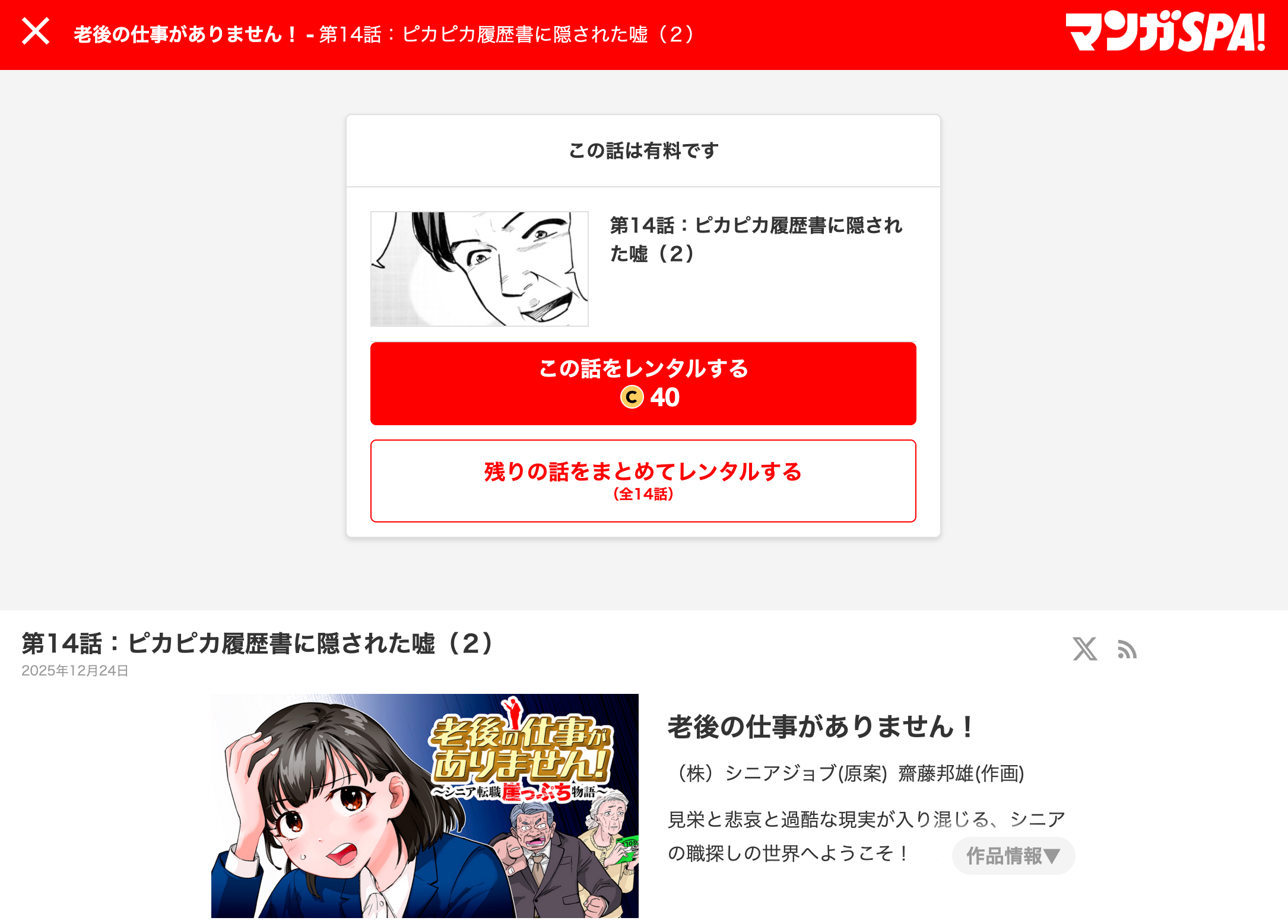当社が原案を担当し、雑誌「週刊SPA!」の公式マンガサイト「マンガSPA!」で連載されているマンガ「老後の仕事がありません!」の最新回「第14話:ピカピカ履歴書に隠された嘘(2)」が2025年12月24日に公開されました。