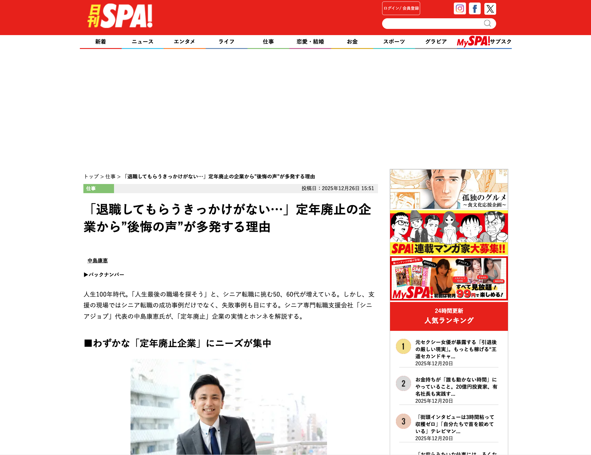 日刊SPA!で当社代表中島が連載するコラム最新作が12月26日に公開、「定年廃止」を後悔する企業が出てきている背景を紹介しています