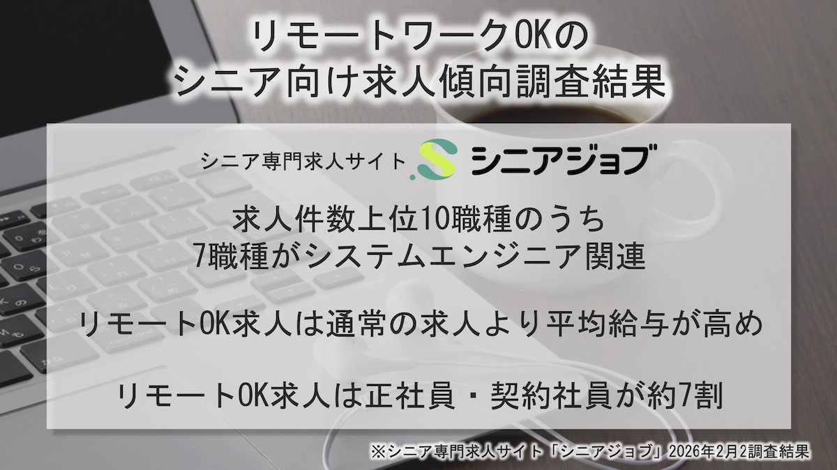 シニア転職支援の株式会社シニアジョブ(本社:東京都新宿区/代表取締役 中島康恵)は、運営するシニア専門求人サイト「シニアジョブ」に掲載されたリモートワークの求人を調査しました。シニア向けのリモートワークの求人は件数が多い上位10職種中7職種がシステムエンジニア関連職種で、雇用形態は正社員が約半数ともっとも多い結果となりました。