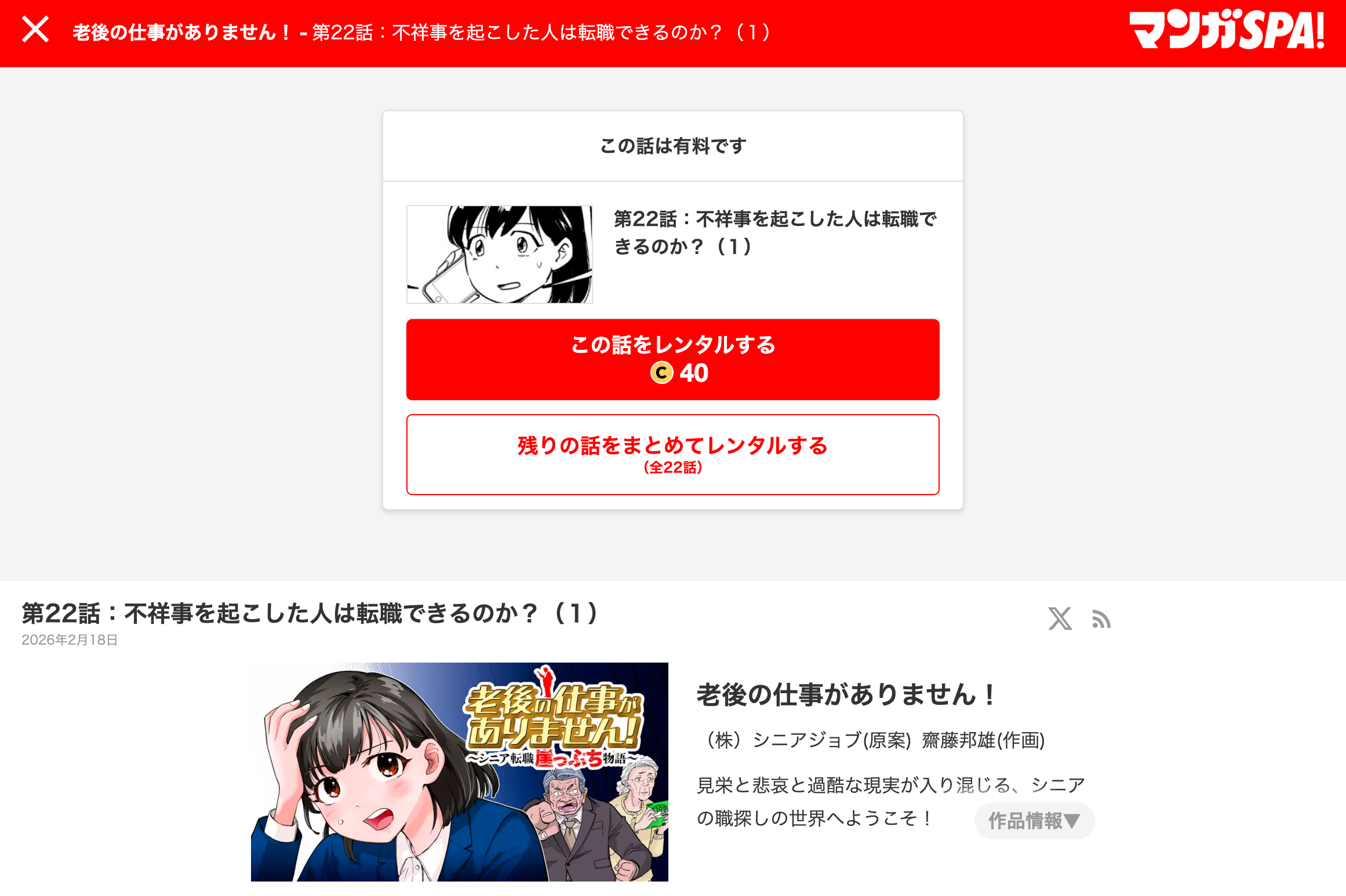 当社が原案を担当し、雑誌「週刊SPA!」の公式マンガサイト「マンガSPA!」で連載されているマンガ「老後の仕事がありません!」の最新回「第22話:不祥事を起こした人は転職できるのか?(1)」が2026年2月18日に公開されました。