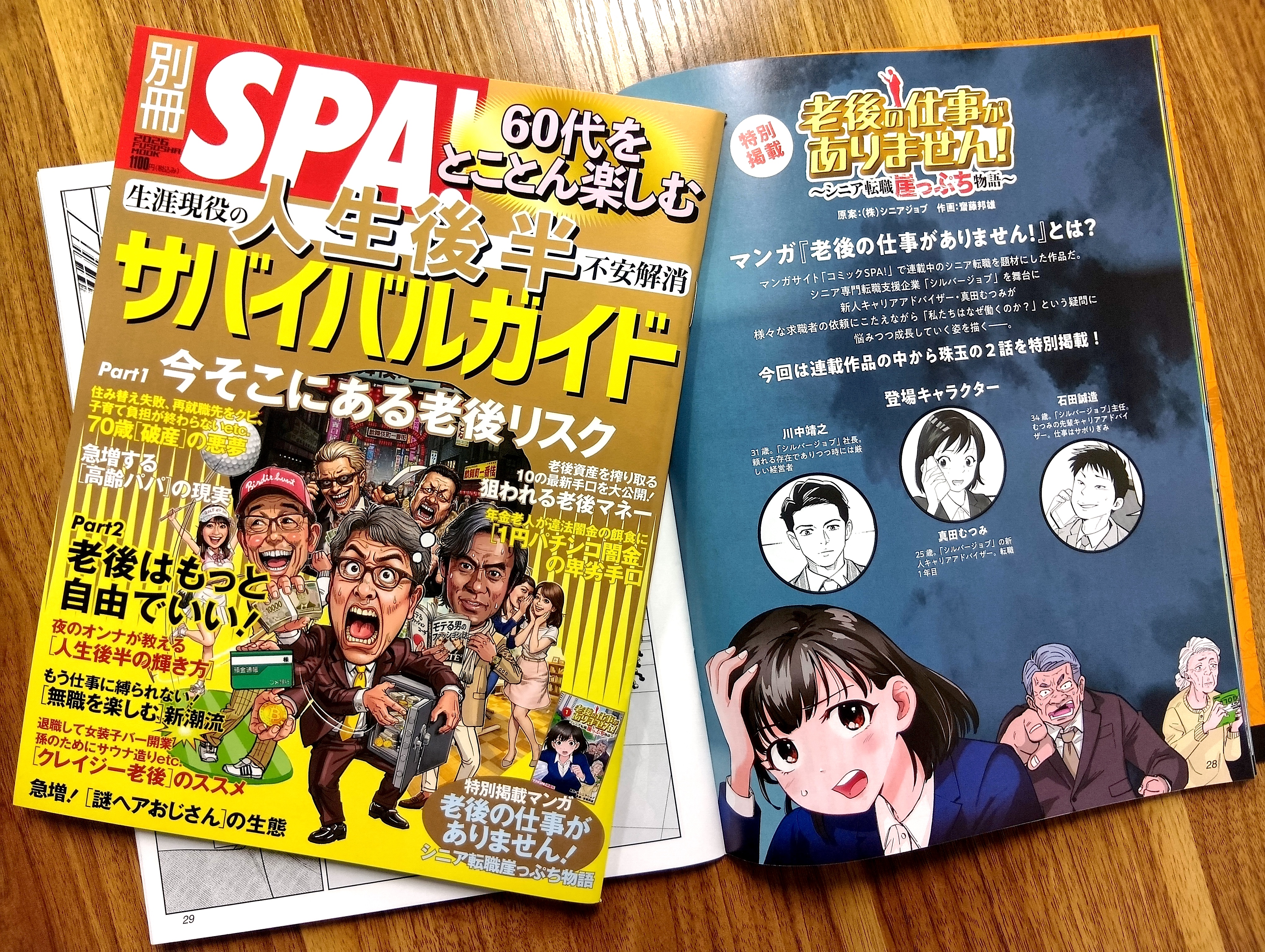 2026年2月17日発行の週刊SPA!のムック「別冊SPA!60代をとことん楽しむ 人生後半サバイバルガイド」に、マンガSPA!で連載中の当社原案のマンガ『老後の仕事がありません!〜シニア転職崖っぷち物語〜』から2話分が特別掲載されました。