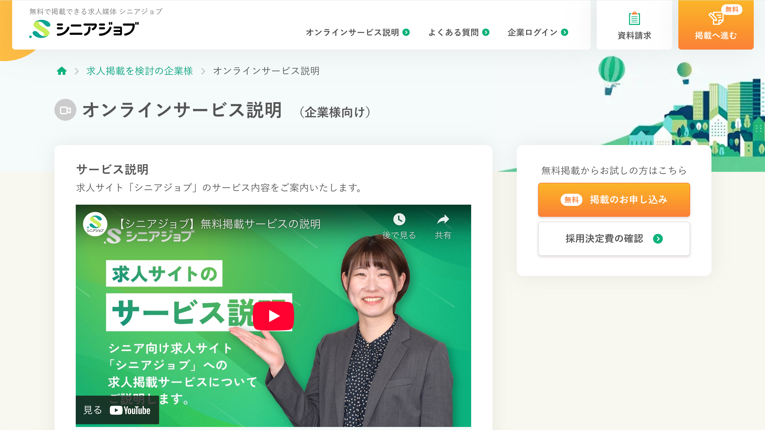 Webページの最上部、および最下部にある「求人掲載を検討の企業様」をクリックすると、最上部、および最下部に「オンラインサービス説明」のボタンが表示され、その先でオンラインサービス説明があります。「求人掲載を検討の企業様」のページ下方にもオンラインサービス説明の動画を見ることができます。