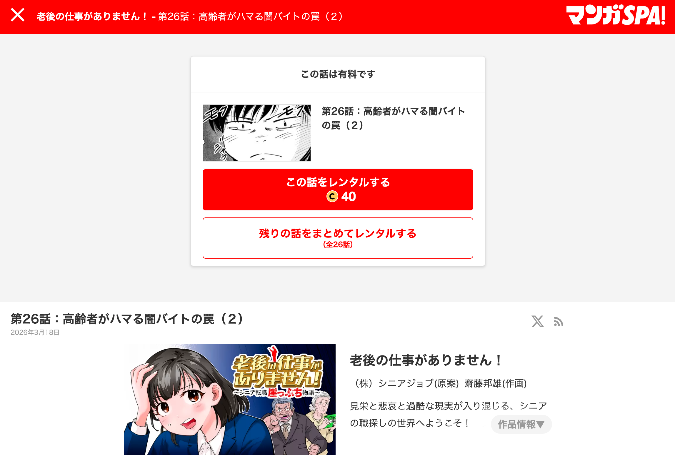 当社原案マンガ『老後の仕事がありません!』の第26話が週刊SPA!の公式マンガサイト、マンガSPA!で公開されました