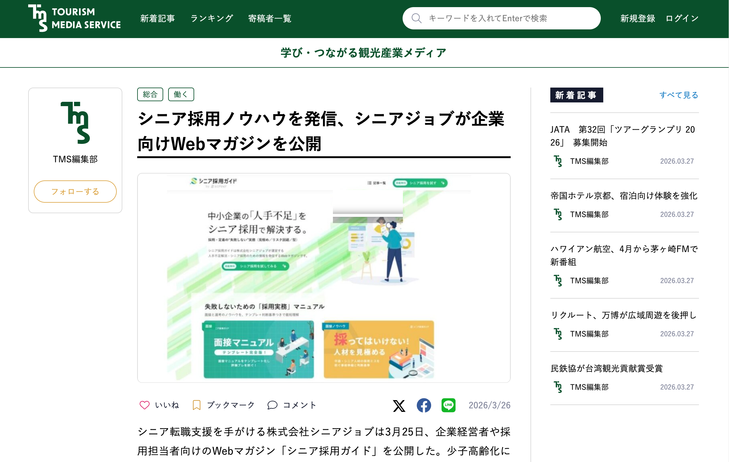 株式会社ツーリンクスが運営する学び・つながる観光産業メディア「ツーリズムメディアサービス」で2026年3月26日、「シニア採用ノウハウを発信、シニアジョブが企業向けWebマガジンを公開」と題した当社に関する記事が掲載されました。