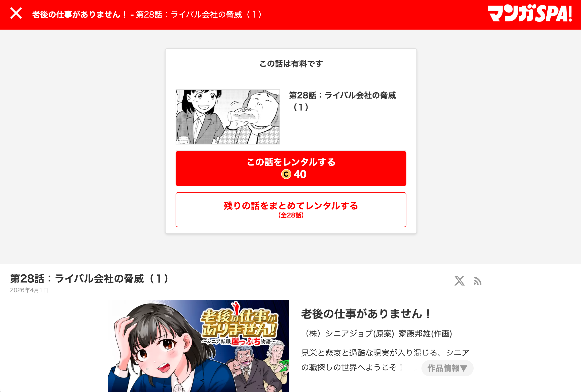 当社が原案を担当し、雑誌「週刊SPA!」の公式マンガサイト「マンガSPA!」で連載されているマンガ「老後の仕事がありません!」の最新回「第28話:ライバル会社の脅威(1)」が2026年4月1日に公開されました。