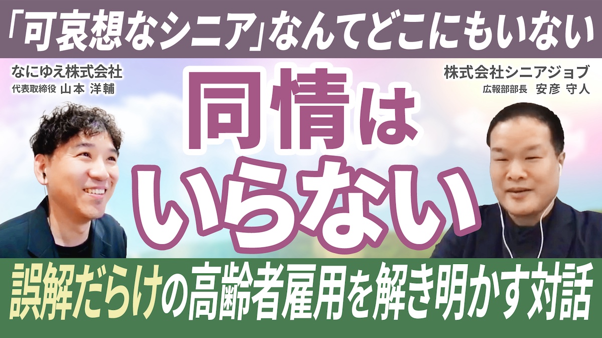- タイトル: 「悲惨な現実は、あえて見せない」 “野生の広報”が仕掛ける、社会の誤解をハックする戦い方|株式会社シニアジョブ 広報部部長 安彦守人さん対談