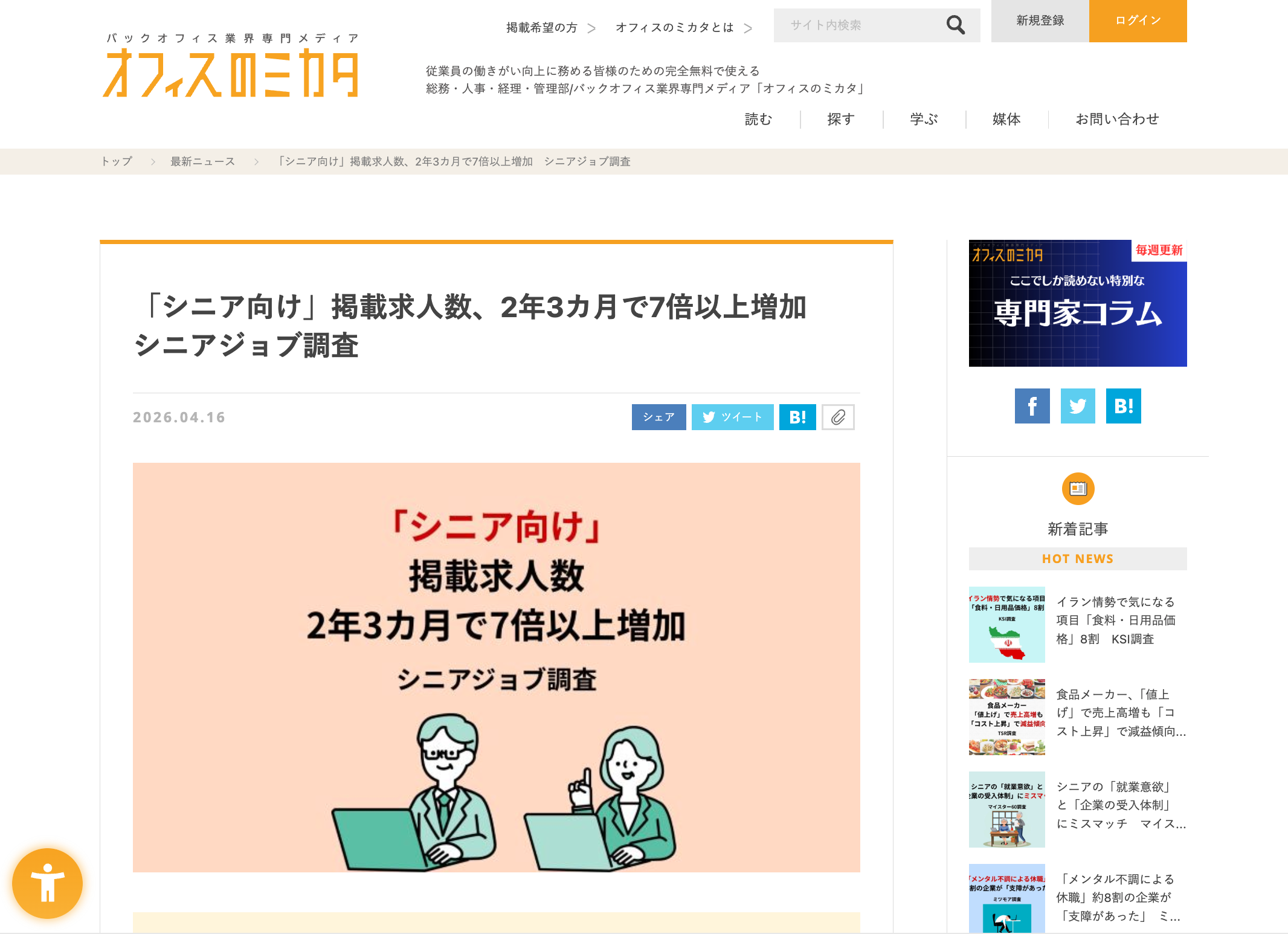 バックオフィス業界専門メディア『オフィスのミカタ』に、『「シニア向け」掲載求人数、2年3カ月で7倍以上増加 シニアジョブ調査』と題した当社の記事が、2026年4月16日に掲載されました。